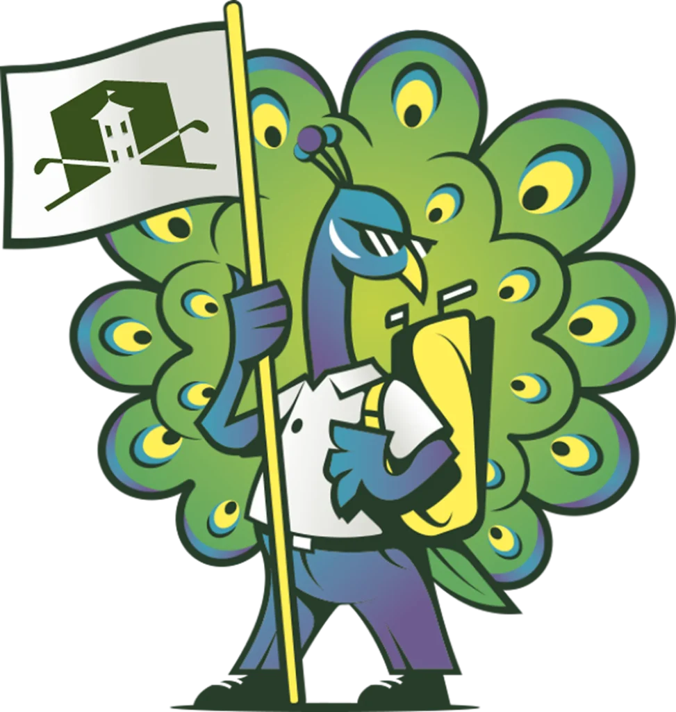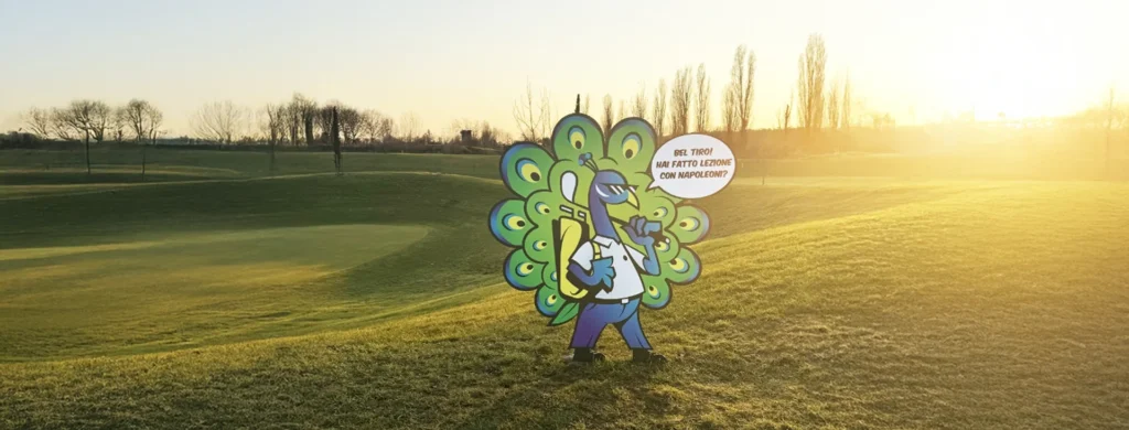 Un personaggio unico creato ad hoc da un illustratore, ispirato ai splendidi pavoni che si pavoneggiano liberamente sul nostro green.
